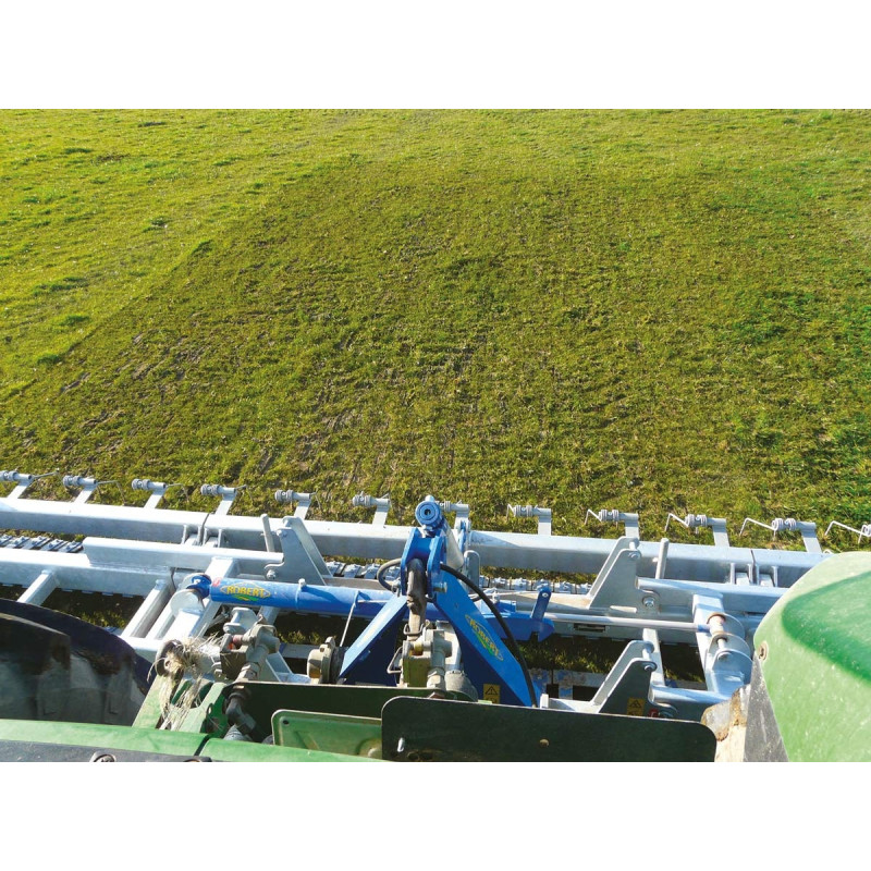 Druckeinstellung an den Vertikutierzinken durch verzinkte Zugstangen, die je nach Bedarf eine Anpassung des Drucks ermöglichen.