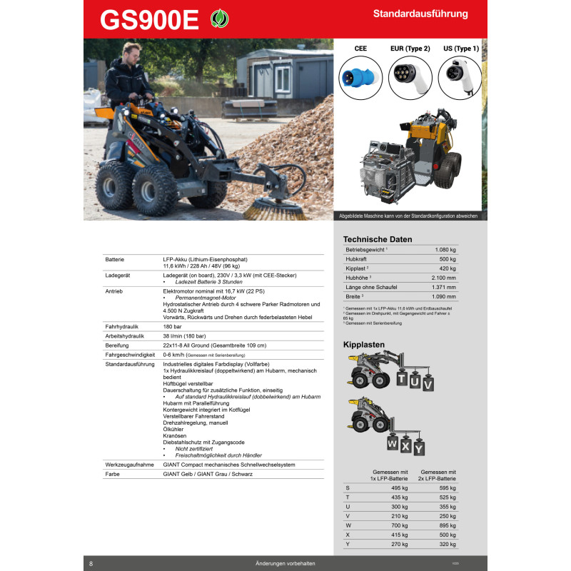Der Skid-Steer-Lader GS900e ist mit einer LFP-Batterie (Lithium-Eisen-Phosphat) mit einer Kapazität von 11,6 kWh ausgestattet und verfügt über ein Bordladegerät mit 230 V / 3,3 kW, mit dem er in 3 Stunden vollständig aufgeladen werden kann.