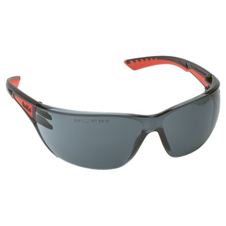 Leichte Schutzbrille ohne Gestell BOLLÉ mit einer stark nach hinten gezogenen Form, kratzfeste Polycarbonatscheiben, Universalnasensteg mit breiter Auflagefläche, Gewicht nur ca. 28 g! NESS+: Rauchgraue, kratzfeste, beschlagfreie Scheiben PLATINUM.