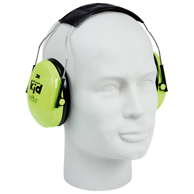 Kapselgehörschutz 3M PELTOR für Kinder, leuchtgrün, flüssigkeits- und schaumstoffgefüllte, auswechselbare Ohrenkissen, Kunststoff-Kopfbügel und verstellbare Stahldraht-Kapselhalterungen. Gewicht ca. 175 g.
