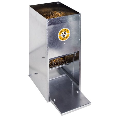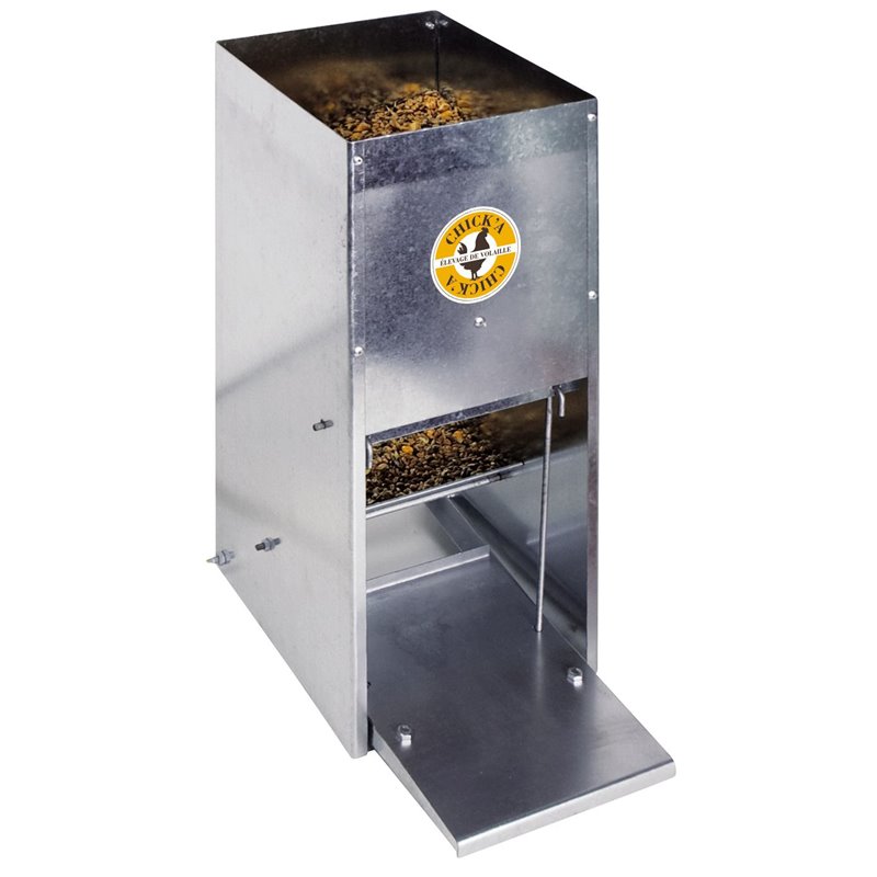 L'ouverture automatique de la trémie se fait simplement par pression de la pédale. Lorsque la volaille se présente devant la mangeoire, elle monte sur la pédale qui, sous l'effet de son poids, ouvre le compartiment où se trouve la nourriture.